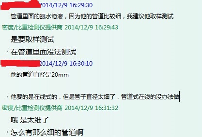 儀特諾一個(gè)長(zhǎng)期合作銷售商近日咨詢我們,因其客戶的氨水管道直徑為20MM,管道太細(xì),沒法使用在線式的液體密度計(jì),故推薦我們的臺(tái)式密度計(jì)給客戶來取樣測(cè)試。(儀特諾臺(tái)式液體密度計(jì)測(cè)氨水用戶:北京安泰科技股份有限公司)