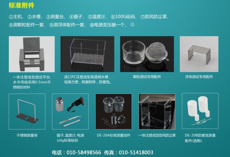 主機(jī)一臺、鑷子一支、溫度計(jì)一支、砝碼一個、防風(fēng)防塵罩一套、固體水槽一個、固體測量臺一件、測顆粒裝置一套、測浮體配件一套、液體測量放置板一塊、液體測量支架一個、DE-20A標(biāo)準(zhǔn)液體測量組件一套、電源變壓器一個